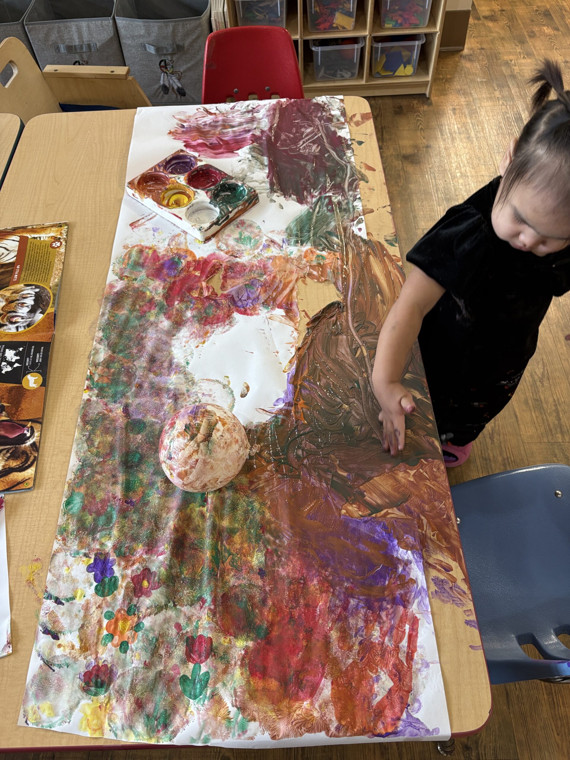 Today, I observed a child fully engaged in a painting activity that encouraged creativity and sensory exploration. She used her hands to mix and spread different colors across the paper, experimenting with texture and blending. I noticed how focused she was on the process, exploring the cause and effect of her movements rather than aiming for a specific outcome. This experience supported her fine motor skills, sensory development, and self-expression. It also reinforced my understanding of the importance of providing open-ended, process-based art experiences that allow children to explore freely and make their own discoveries.